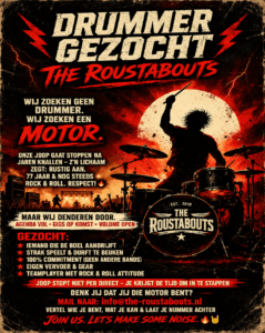 En wie weet zit jij binnenkort achter het drumstel bij The Roustabouts.